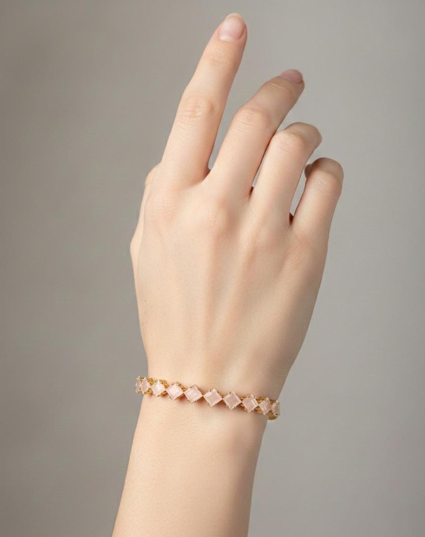 Add a touch of soft elegance to your wrist with this stunning Blush Stone Bracelet. Featuring a continuous row of diamond-shaped rose quartz stones, itβs the perfect blend of geometric modernism and romantic charm. ποΈβ¨